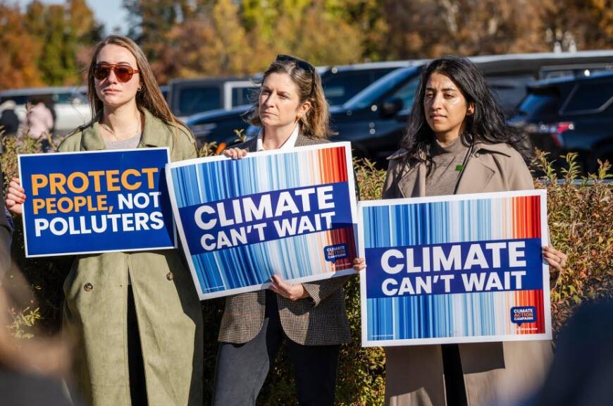 Climate change activists hold signs during a news conference with members of the House Sustainable Energy and Environment Coalition on Capitol Hill in Washington on Nov. 13, 2025. Since taking office, President Donald Trump has slashed subsidies and canceled permits on federal lands for wind and solar energy—an industry that has long thrived on government subsidies. Madalina Kilroy/The Epoch Times