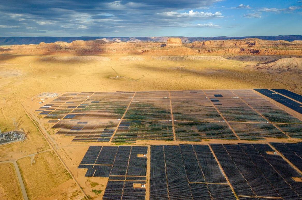 An aerial view shows the Kayenta Solar Plant in Kayenta, Ariz., on June 23, 2024. Observers said that the true aggregate cost of renewable energy is often understated because existing utilities must build the new lines to carry power from remote wind and solar sites to cities and towns. Brandon Bell/Getty Images