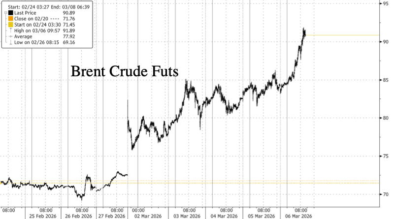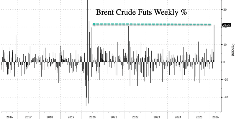 Brent crude futures are on track for their biggest weekly gain since the early days of Covid, with the move now exceeding the 20% weekly spike at the start of the Russia-Ukraine war, as the U.S.-Israeli air campaign against Iran, Operation Epic Fury, has tipped the Gulf into an energy crisis, freezing commercial traffic through the Strait of Hormuz and pushing some regional oil and gas production offline.