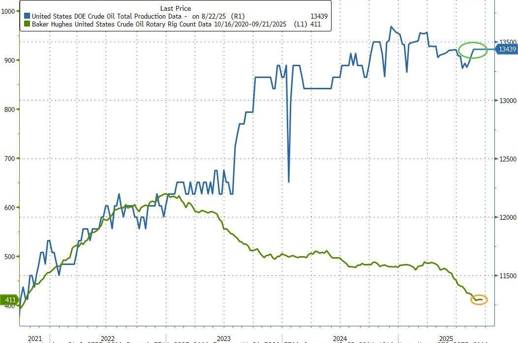 US Crude production hovered near record highs as the decline in rig counts has stalled...