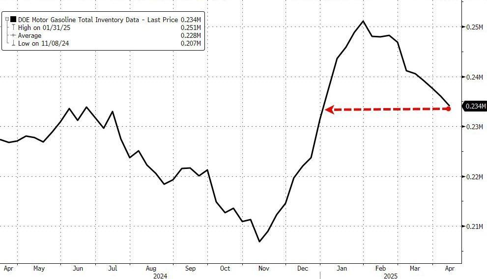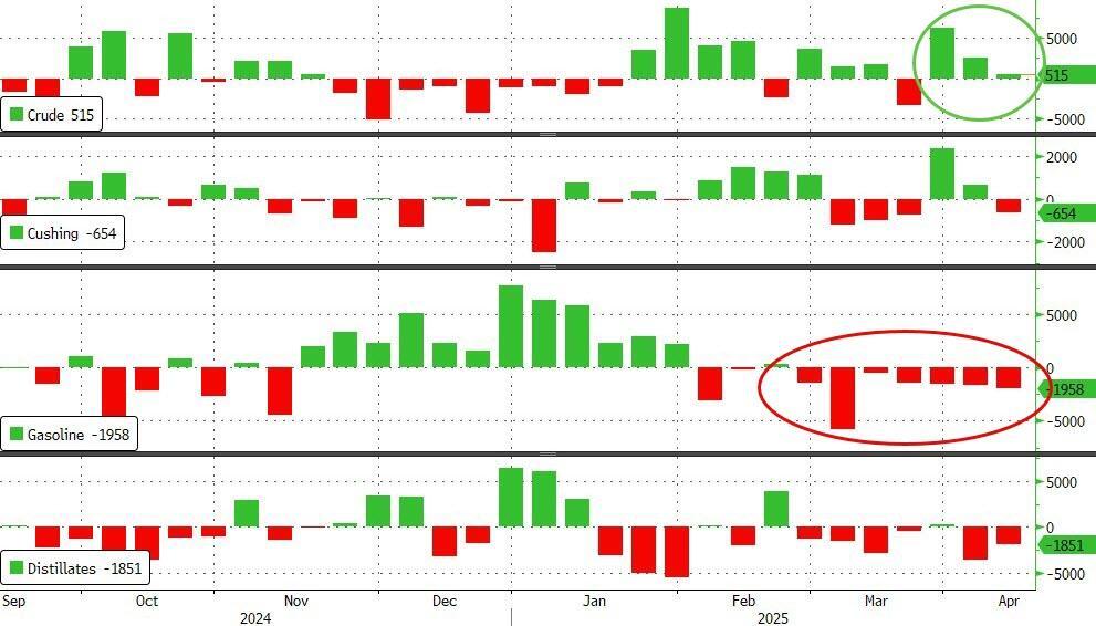 Crude stocks rose for the 3rd straight week (but only adding 515k barrels - a lot less than the 2.4mm build reported by API) while Gasoline stocks fell for the 7th straight week...