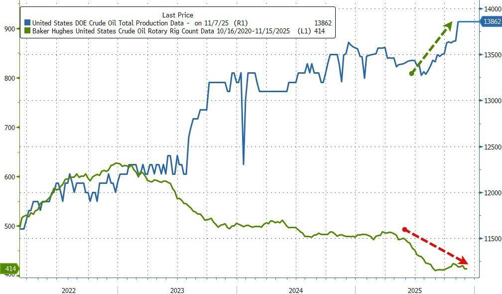 US Crude production surged by over 200k b/d last week to a new record high despite the ongoing slide in the rig count...