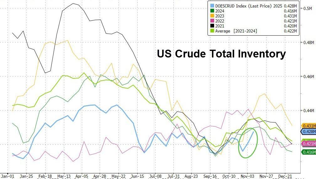 Crude inventories surged higher for the second week in a row (biggest build since July), modestly offset by small drawdowns for products (down for six straight weeks)...