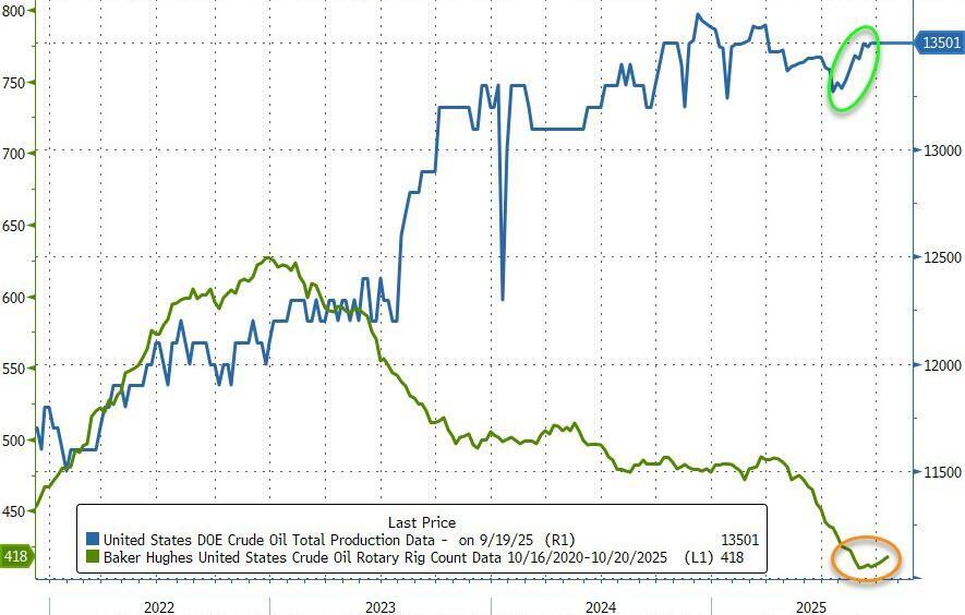 US production rose 19k barrels/day on the week, back near record highs, despite the big drop in rig counts...