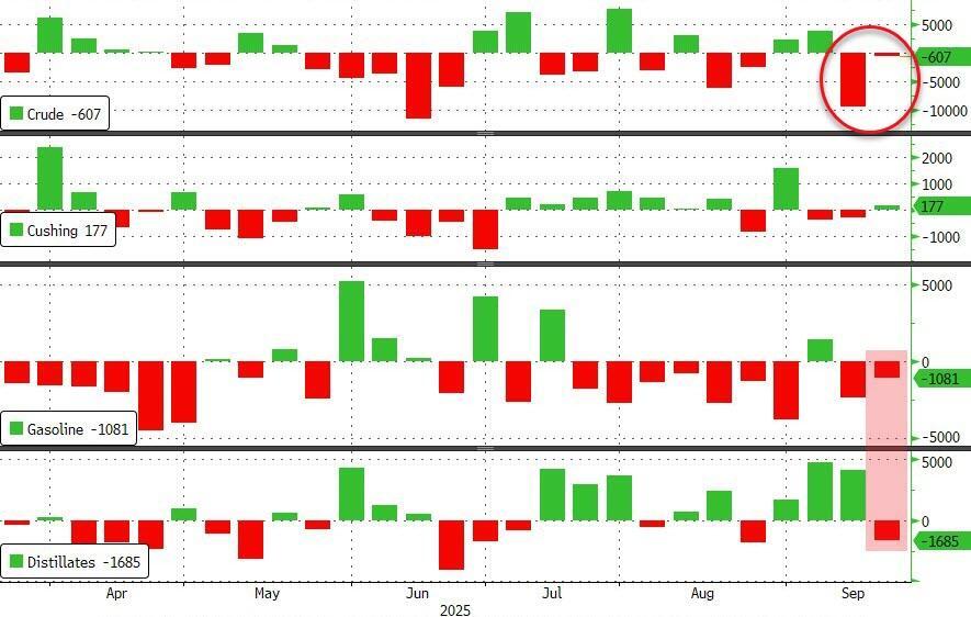 Following last week's huge draw, crude inventories were expected to tumble once more (and did according to API), but the official data showed a very modest 607k drawdown in crude stocks while products saw significant draws too...