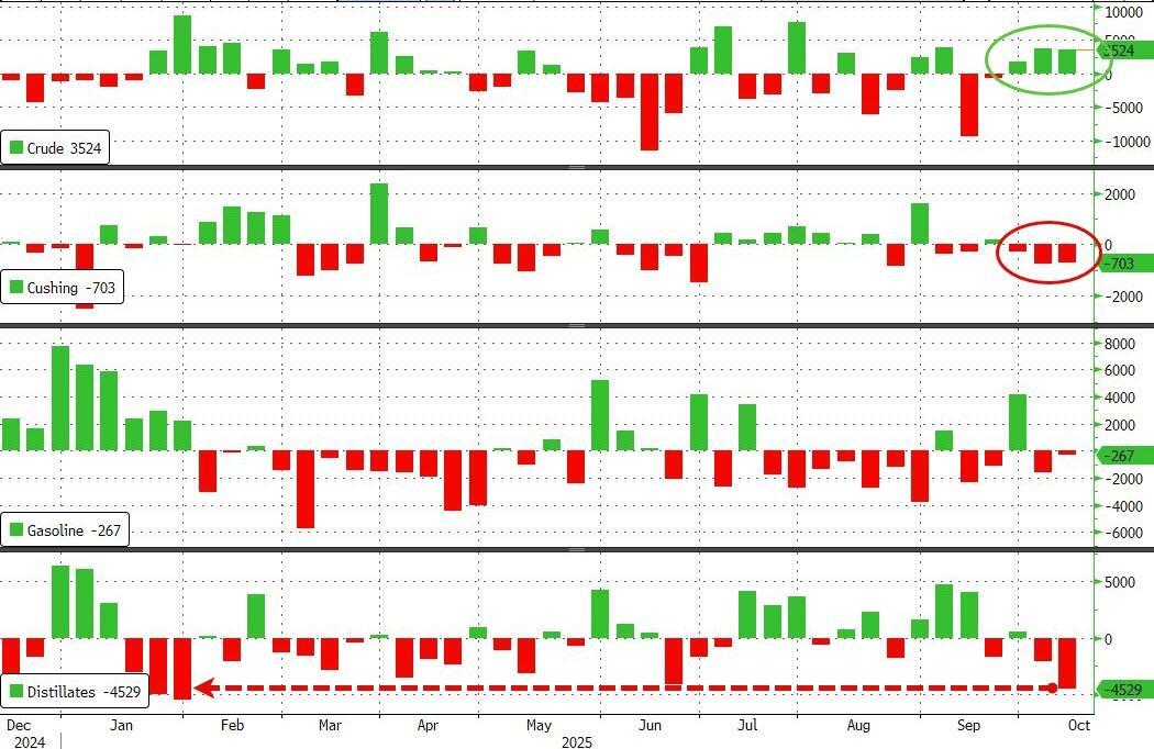 he official crude build of 3.52mm barrels was modest (and well below the huge 7.4mm barrel build reported by API). That is the 3rd weekly build in crude stocks in a row (and 3rd weekly draw in stocks at Cushing). Distillates inventories plunged by 4.53mm barrels - the biggest draw since January - perhaps affected by the El Segundo refinery fire