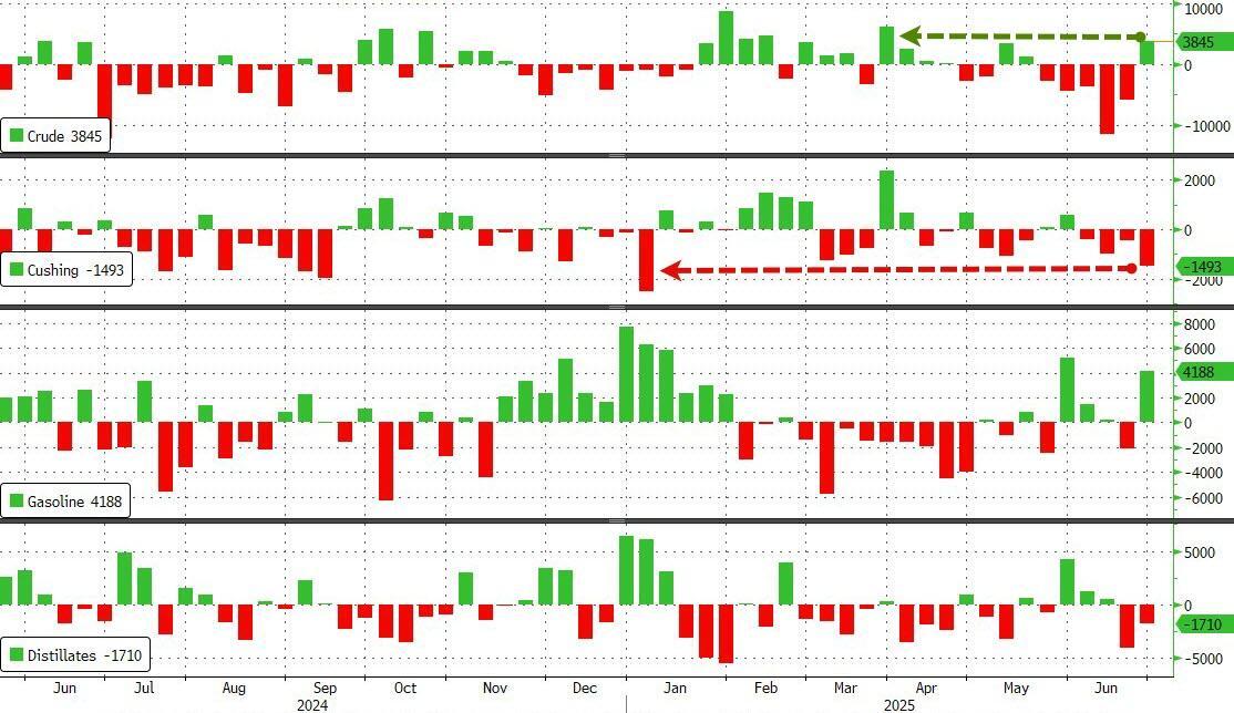 A big crude build (the first in six weeks and biggest since March) was offset by a relatively big drop in stocks at the all important Cushing Hub last week as gasoline inventories surged and distillates declined...