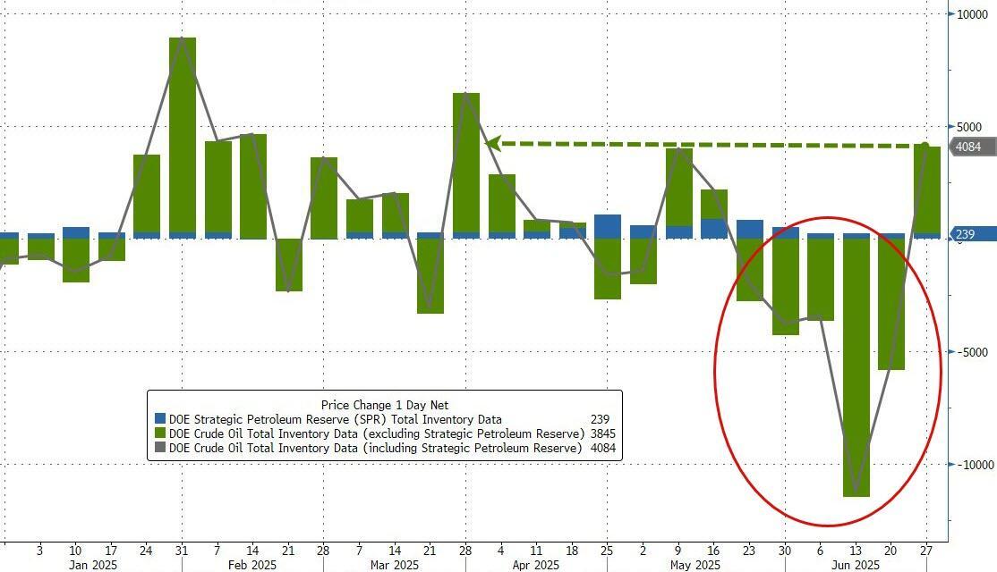 Including a small 239k addition to the SPR, last week saw the biggest build in total crude stocks since the start of April...