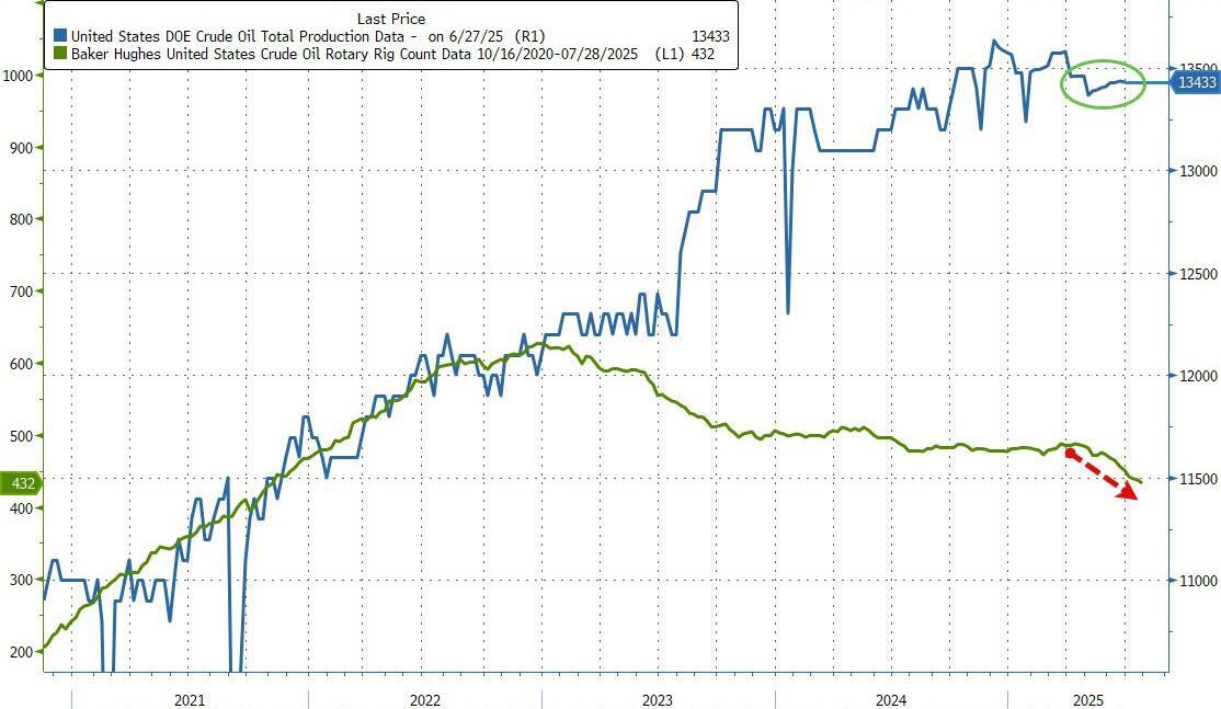 US Crude Production was basically flat at or near record highs despite the rig count continuing to decline...