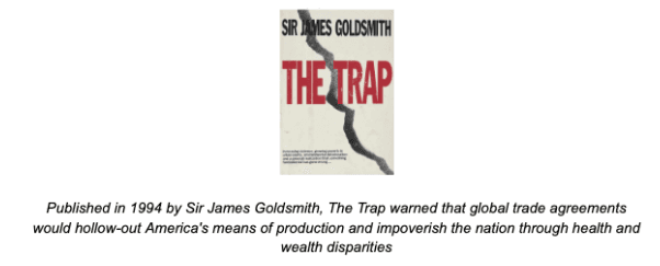 By the 90's, Goldsmith was a multi-billionaire who had grown Cavenham Foods to the third-largest food company in the world. The original MAHA leader, Goldsmith entered politics to fight for decentralization, healthy, and redundant food systems. His book, "The Trap," not only warned what globalization would do to the United States at a time when it needed to focus on rebuilding local infrastructure, but also warned how globalization would create a trap of chronic illness and dependency upon the government.