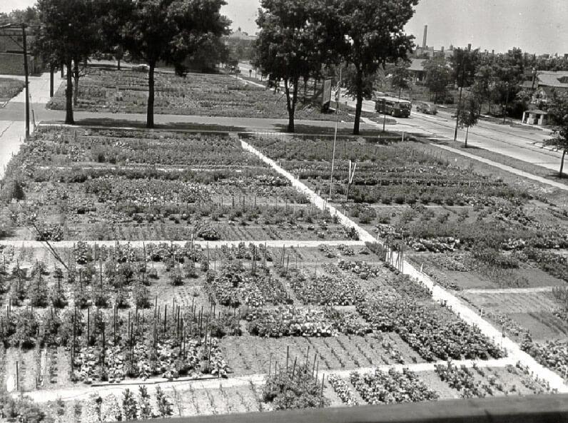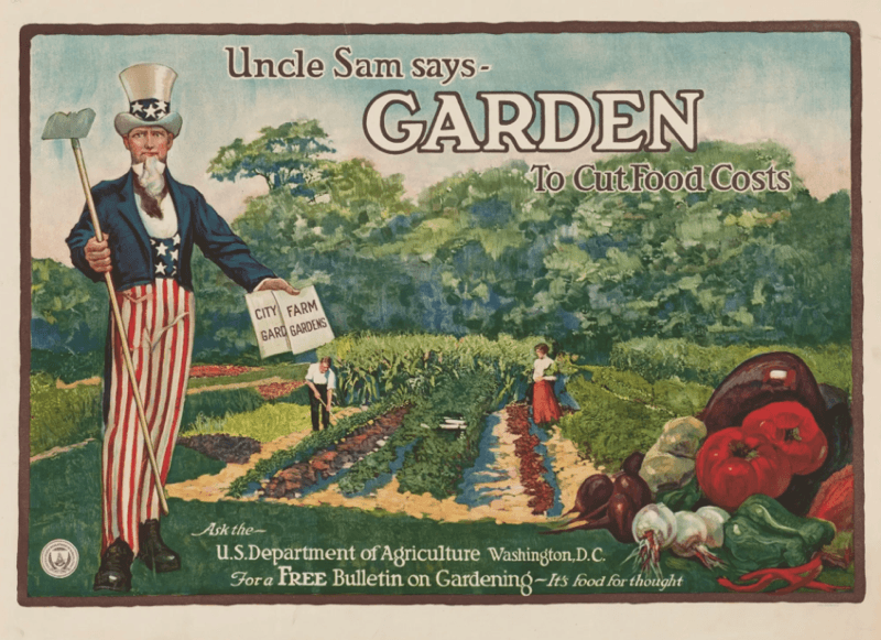 Between 1943 and 1944, Americans planted upwards of 20 million victory gardens. These gardens produced 10 million tons of food annually, almost entirely fresh vegetables. They were planted in backyards, community plots, and schools, and they matched or exceeded the commercial vegetable production of the entire U.S. farming sector at the time. The most common crops included tomatoes, beans, carrots, beets, lettuce, squash, and potatoes.
