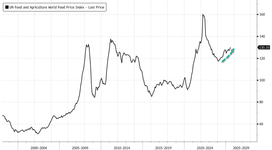 The FAO Food Price Index has undergone a significant reversal since bottoming out in early 2024, following a downturn after the price spikes during Covid and Russia's invasion of Ukraine. It is now at its highest level since February 2023, up 43% from its early Covid-era lows, and will likely remain elevated into next year.