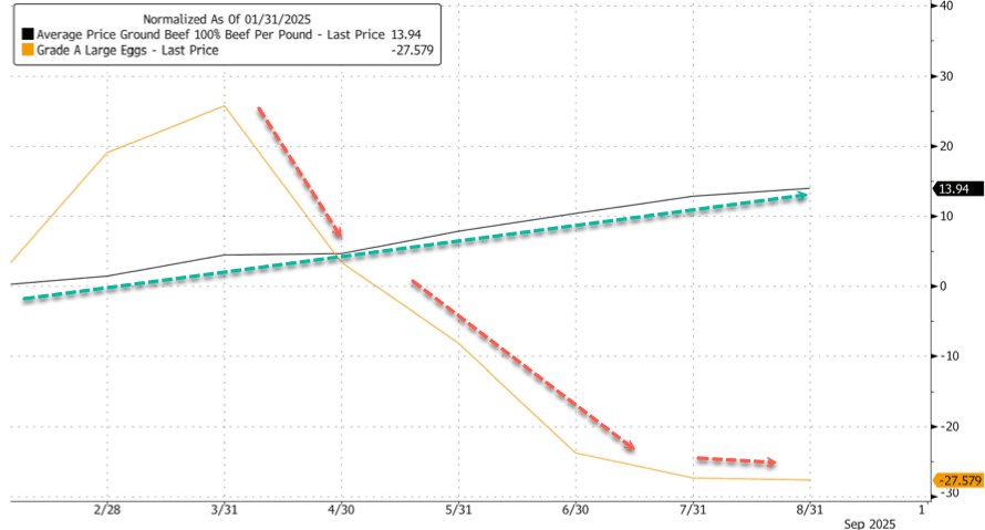 Beef inflation is sticky, while egg prices have cooled.