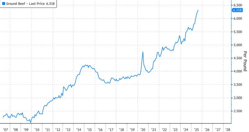The best bang for the buck in the grocery store protein aisle this year hasn't been beef, it's been eggs. Prices have plummeted thanks to President Trump's swift action to fix the Biden-Harris regime's botched bird flu culling disaster. By contrast, ground beef has surged to a record $6.32 per pound, squeezed by the smallest US cattle herd in decades, with a bleak outlook despite some signs of a rebuilding phase nearing.