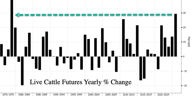 U.S. cattle futures are on track for their largest year-to-date gain since 1978 amid an ongoing beef cow shortage. The shortage has driven prices for feedlot cattle to record highs, with charts resembling those of gold or silver, and pushed USDA ground beef prices at supermarkets to record highs. Although Goldman has noted that the 12-year cattle herd cycle has reached a cyclical low, and Tyson CEO Donnie King recently said herd rebuilding will begin in 2026, prices continue to spiral out of control.