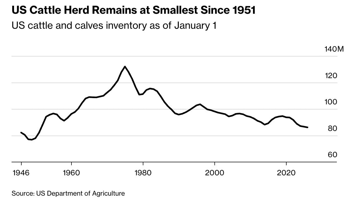 Bloomberg data shows the total US cattle herd size nears a 75-year low.