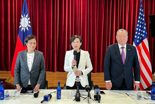 Taiwan's chief trade negotiator, Yang Jen-ni (L), Taiwanese Vice Premier Cheng Li-chiun (C), and Taiwan’s top representative to the United States, Alexander Yui (R), speak at a press conference at the Taipei Economic and Cultural Representative Office in Washington on Jan. 16, 2026. Eva Fu/The Epoch Times