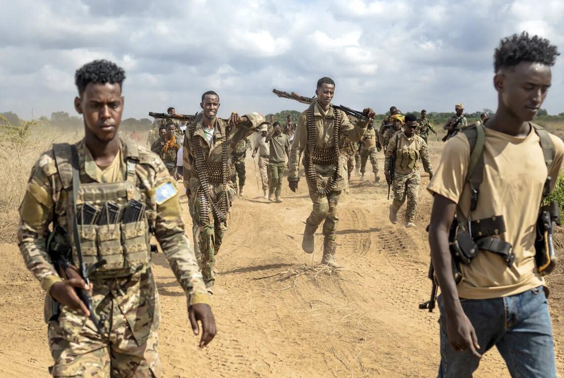 Soldiers of the Somalia National Army walk near the frontlines at Sabiid, one of the towns they have liberated from the Al-Qaeda-linked terrorists, Al-Shabaab, in Somalia's lower-Shabelle region on Nov. 11, 2025. Tony Karumba/AFP via Getty Images