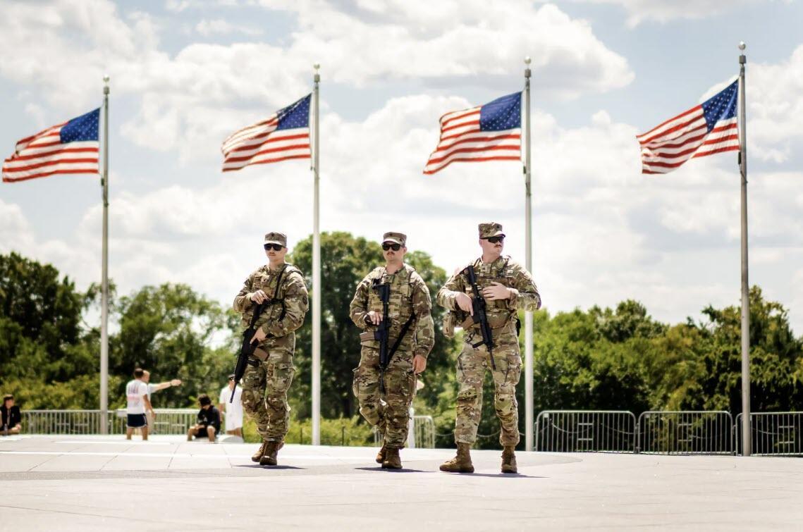 National Guard members patrol the National Mall in Washington on Aug. 27, 2025. Madalina Kilroy/The Epoch Times