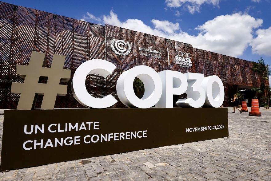 The COP30 logo is seen in front of the central building ahead of the COP30 Brazil Amazonia 2025 in Belem, Brazil, on Nov. 3, 2025. The Conference of the Parties (COP) meets annually to discuss and negotiate on climate-related issues. Wagner Meier/Getty Images