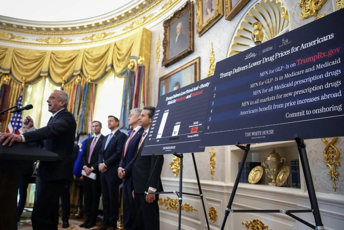 Health Secretary Robert F. Kennedy Jr. speaks next to charts displaying drug prices at an event in which President Donald Trump delivered remarks on lowering drug prices in the Oval Office on Nov. 6, 2025. Trump announced that his administration has reached agreements with drugmakers Eli Lilly and Novo Nordisk that would lower the price of some GLP-1 weight loss medications. Andrew Harnik/Getty Images