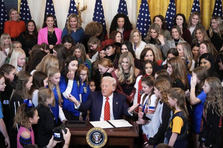 President Donald Trump joined by women athletes signs the “No Men in Women’s Sports” executive order in the East Room at the White House on Feb. 5, 2025. The executive order, which Trump signed on National Girls and Women in Sports Day, prohibits males who identify as transgender women from competing in women’s sports. Andrew Harnik/Getty Images