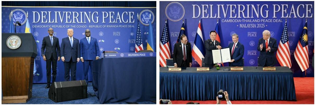 (Left) U.S. President Donald Trump (C) hosts the signing ceremony of a peace deal with the President of Rwanda Paul Kagame (L) and the President of the Democratic Republic of the Congo Felix Tshisekedi (R) at the United States Institute of Peace in Washington on Dec. 4, 2025. (Right) Malaysian Prime Minister Anwar Ibrahim (L) and U.S. President Donald Trump (R) watch as Thailand's Prime Minister Anutin Charnvirakul (2nd L) and Cambodia's Prime Minister Hun Manet (2nd R) hold up a document after the ceremonial signing of a cease-fire agreement between Thailand and Cambodia on the sidelines of the ASEAN Summit in Kuala Lumpur, Malaysia, on Oct. 26, 2025. Andrew Caballero-Reynolds/AFP via Getty Images, Mohd Rasfan/Pool/AFP via Getty Images