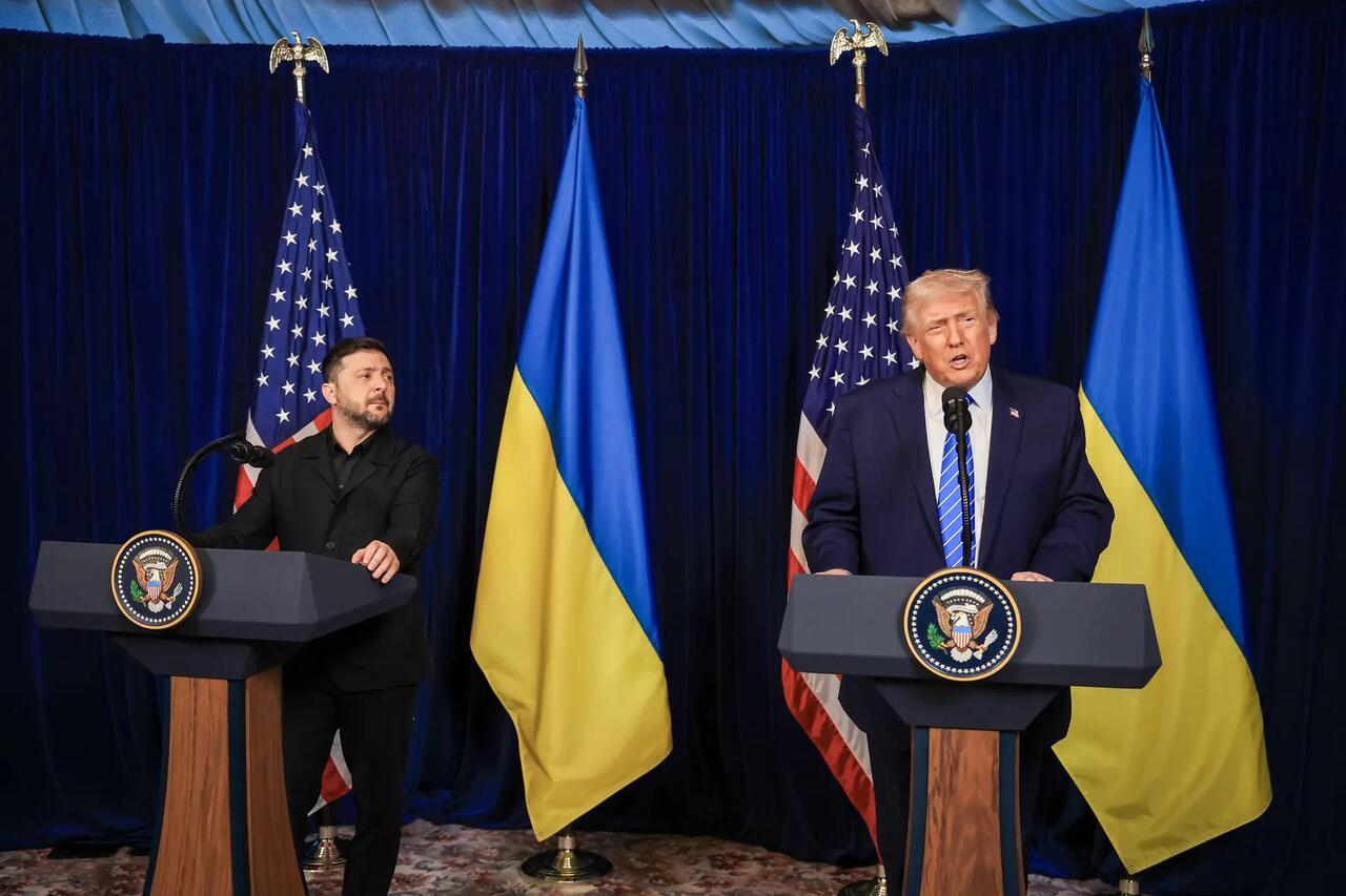 U.S. President Donald Trump speaks alongside Ukrainian President Volodymyr Zelenskyy during a press conference following their meeting at Mar-a-Lago in Palm Beach, Fla., on Dec. 28, 2025. Trump invited Zelenskyy to work on the U.S.-proposed peace plan to end the Russia–Ukraine war. Joe Raedle/Getty Images