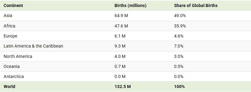Latin America and the Caribbean are expected to see 9.3 million births, or 7% of the total, while Europe accounts for just 4.6%. North America’s share stands at 3%, reflecting lower fertility rates despite population growth driven by migration. Oceania contributes 0.5% of births, and Antarctica, with no permanent population, records no births at all.