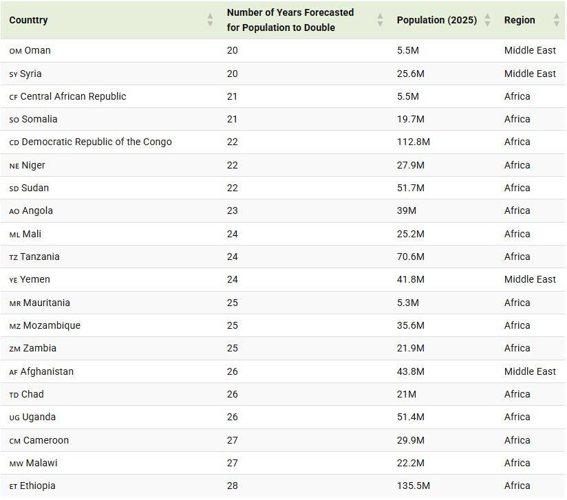 As we can see, Oman and Syria are set to double their population in just 20 years.
