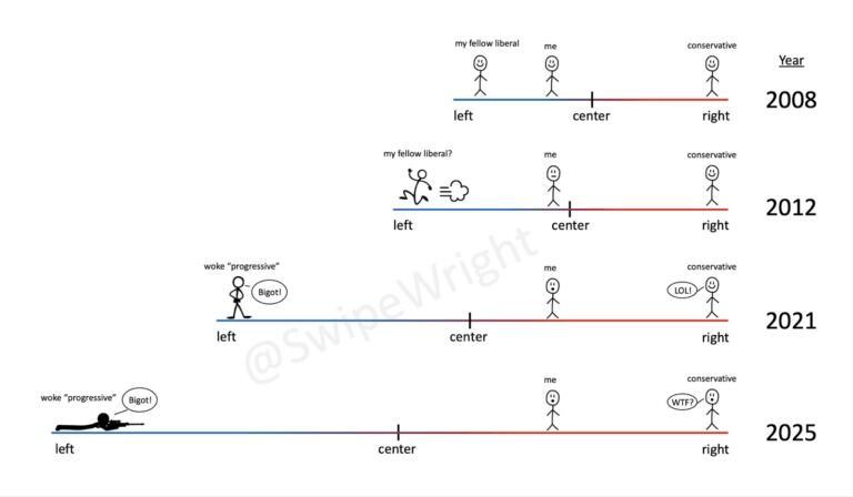 The word “bigotry” has long been associated with backward, conservative values. Manhattan Institute Fellow Colin Wright captured the left’s lurch towards extremism in a viral meme, updated after Kirk’s assassination: