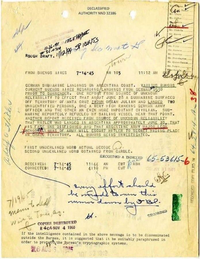 One report, sent from Buenos Aires on July 14, 1945, claimed that “a source of unknown reliability” said “Hitler was landed in Argentina approximately June 20, that his face was disfigured,” and that an Argentine army major was preparing to escort him to a “secret hiding place in Chaco territory.”
