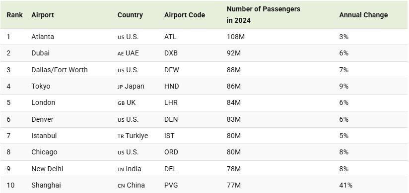 Together, the 10 busiest airports transported 855 million passengers, or 9% of traffic globally. While air traffic has finally surged past pre-pandemic levels, it is not without its challenges of staffing crises, tech outages, and aircraft incidents.