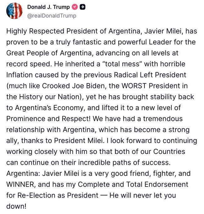 Bessent concluded: "Argentina has the tools to defeat speculators, including those who seek to destabilize Argentina’s markets for political objectives..."