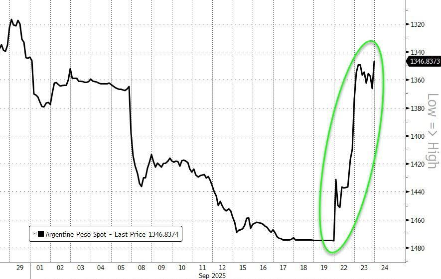 Yesterday, as we detailed here, Argentina assets soared on the heels of US Treasury Secretary Scott Bessent calling the South American country "a systemically important US ally in Latin America," adding that the US Treasury "stands ready to do what is needed within its mandate to support Argentina. All options for stabilization are on the table."