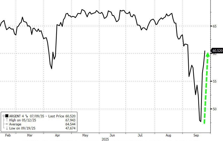 This morning, Argentine bonds are extending gains following a follow-up post on X by Bessent that the Trump administration "stands ready to do what is needed to support Argentina and the Argentine people."