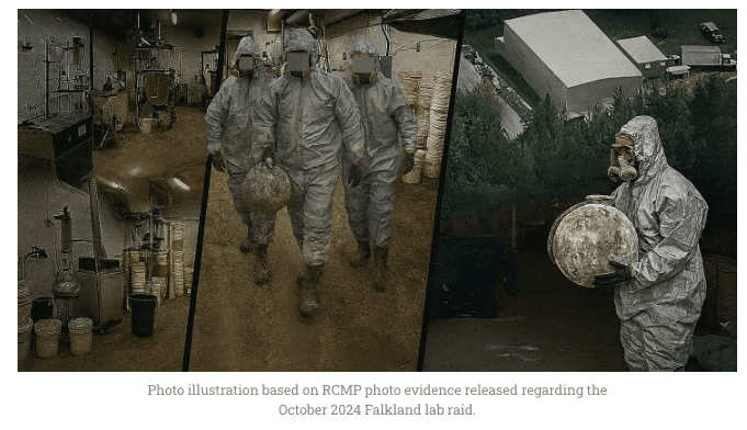 In multiple interviews with senior officials — including Derek Maltz, who retired this year after Mexico carried out an unprecedented wave of extraditions of dozens of cartel leaders to the United States — The Bureau confirmed devastating details of the Falkland superlab in British Columbia, hidden in mountainous terrain between Vancouver and Calgary. The case became public only in October 2024 — to the surprise of DEA investigators — when the RCMP announced it had dismantled what it called the most sophisticated drug laboratory ever uncovered in Canada, capable of producing up to 95 million potentially lethal doses of fentanyl. Investigators seized a staggering half-ton of narcotics: 54 kilograms of fentanyl, 390 kilos of methamphetamine, 35 kilos of cocaine, 15 kilos of MDMA, smaller amounts of cannabis, and large quantities of precursor chemicals from China. Police estimated the street value at about $500 million.