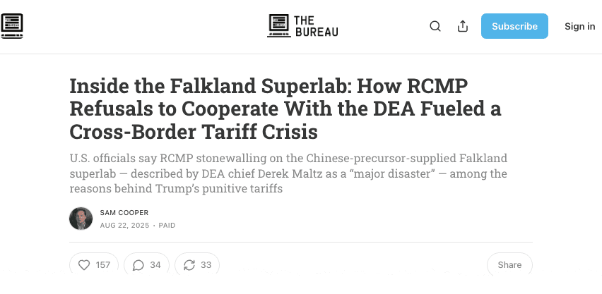 Cooper's latest report focuses on how Canada's federal police (RCMP) refused to cooperate with the U.S. Drug Enforcement Administration (DEA) in 2022 on a probe into a British Columbia fentanyl "superlab" tied to Chinese precursor shipments. It was only after the U.S. Treasury sanctioned Iranian-Canadian businessman Bahman Djebelibak and his Health Canada–licensed Valerian Labs that the RCMP belatedly launched its own investigation, without sharing critical information with the U.S. Gov't.