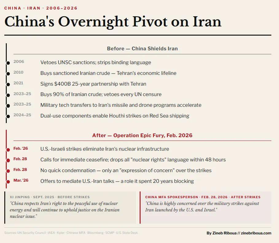First, the Iranian counterweight is gone. In 2021, Xi told senior Party officials that “the East is rising and the West is declining,” that America was “the biggest source of chaos in the present-day world,” and that China was entering a period of strategic opportunity. Iran was central to that thesis. Beijing needed a defiant Tehran to keep Washington pinned down in the Gulf, to sustain a sanctions-proof energy corridor, and above all, to stand as living evidence that American power had hard limits. The entire architecture of CCP’s dogma of inevitability, which rested on Iran’s ability to endure, and Epic Fury removed the foundation in a single afternoon.