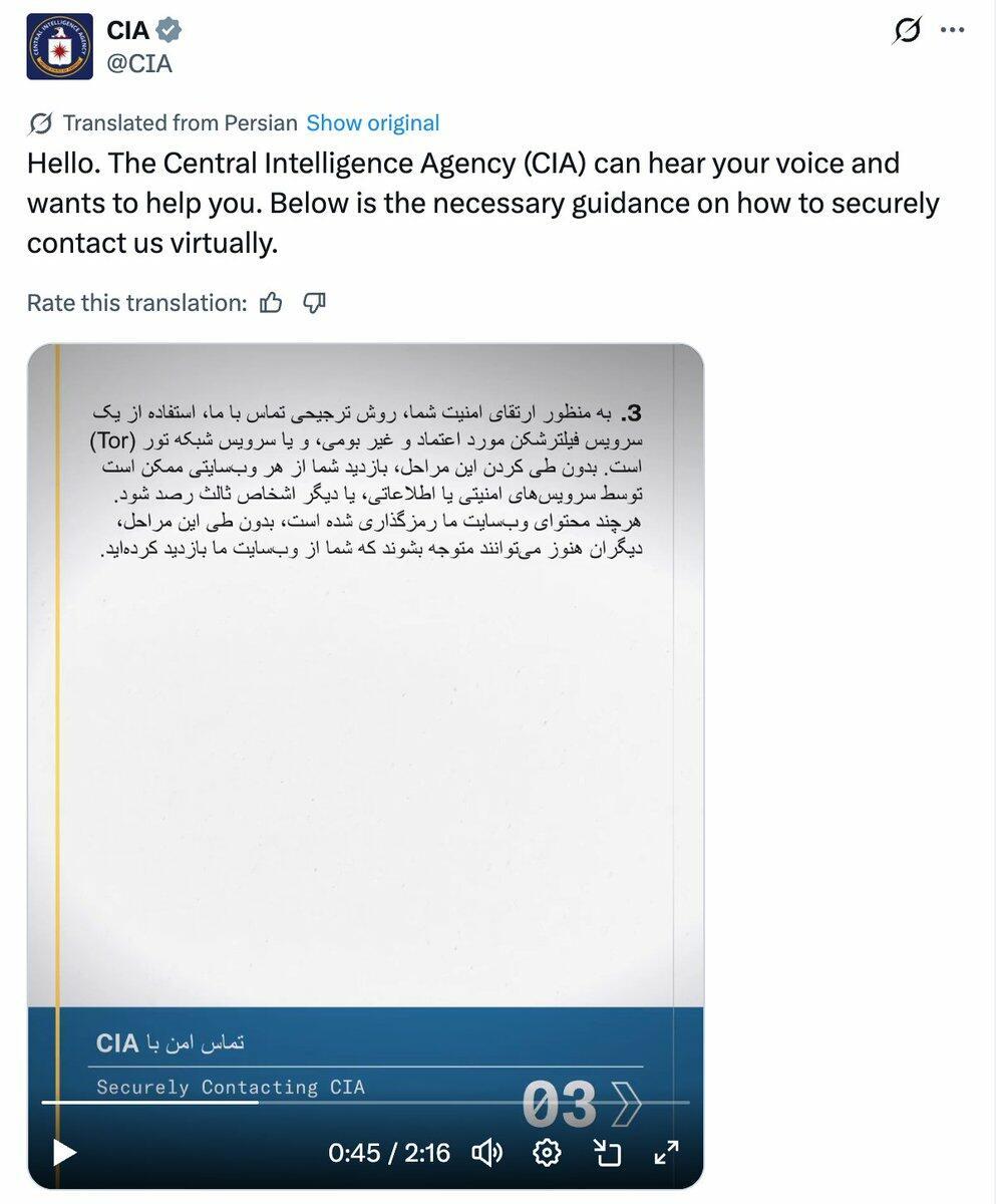 The CIA posted to X, Instagram, and other officially verified platforms a video in Farsi which encourages Iranians to contact the agency, while featuring instructions for using Tor and other encrypted methods to ensure anonymity, and so local Iranian authorities can't uncover the communications.
