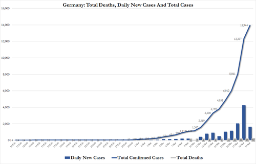 Meanwhile, in Spain, the country's health minister declared that the government of PM Pedro Sanchez will pass a €210 billion stimulus package to help alleviate the crisis as the total number of cases in Spain has climbed 28% to 17,147. 169 new deaths were reported, raising the country's death toll to 767, as we noted earlier.