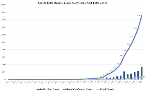 A few minutes ago, Spain reported another alarming jump in deaths and confirmed cases that was on par with the figures coming out of Italy. Spanish Covid-19 cases rose to 17,147 (prev. 13,716) and deaths climbed to 767 (prev. 558):
