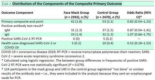According to the report, published in the Annals of Internal Medicine, the "primary outcome" (i.e. infection with COVID-19) occurred in 1.8% of people in the mask group, and 2.1% of people in the control group.