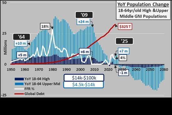 8. Demographics are not supportive of risk-asset expansion. Courtesy of @Econimica, consider this chart of the year-over-year change in high and high-middle-income populations globally. The change is now negative--fewer folks are entering these categories. In response, global debt has soared, in effect offsetting the decline of consumer demographics with borrowed money.