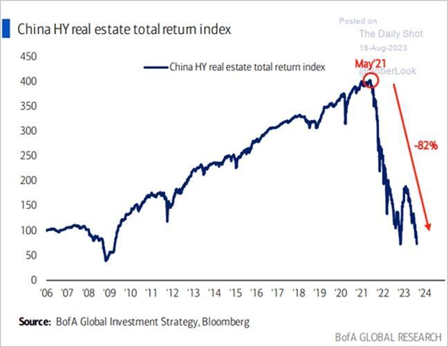 The financial collapses of China Evergrande, Country Garden, and Sunac all come against the background of a broader crash in real estate debt and real estate-backed wealth management products. This chart shows that a major Chinese high-yield real estate index collapsed 82% in recent years and has never recovered.