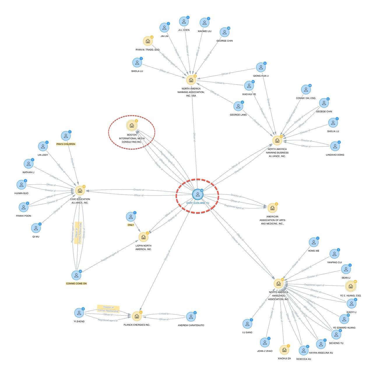 Forensic analysis of public records reveals a web of entities connected to "Gary Guoliang Yu" by one degree of separation, including DCNF's target: Boston International Media Consulting.