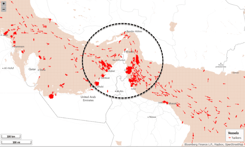 On Sunday morning, Automatic Identification System (AIS) vessel-tracking data showed that tanker traffic through the most critical energy chokepoint in the world, which handles about 20% of global petroleum liquids consumption and roughly 27% of global seaborne oil trade, had slowed to a near standstill, with tankers in holding patterns on both sides of the Strait's entrance and exit.