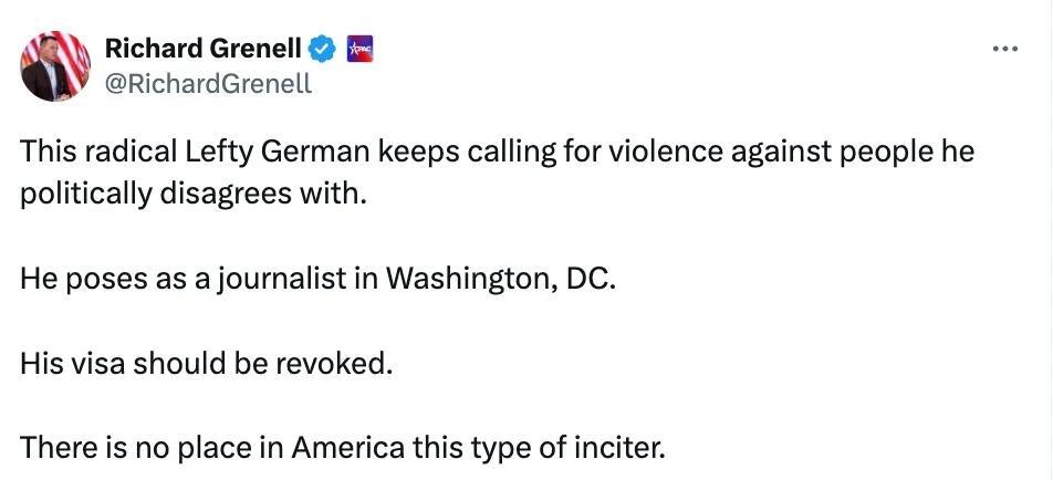 In response to inquiries from BILD, Theveßen said that he “regrets not having been more detailed,” but naturally he stopped short of apologising. After I and others brought Theveßen’s remarks to the attention of the U.S. State Department (along with another podcast appearance in which Theveßen implied that Stephen Miller was a neo-Nazi), Richard Grenell called for authorities to revoke his work visa …