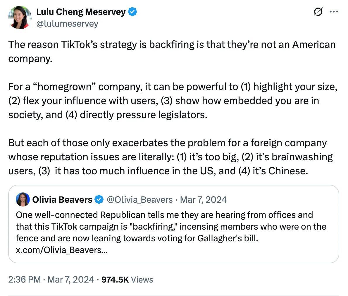 At the time, many veteran PR professionals argued that this strategy would prove to be a destructive to TikTok’s brand and its cause. Lulu Chang Meservey pointed out that a China-based company willing to exert its influence on the American public and pressure regulators would likely face backlash.