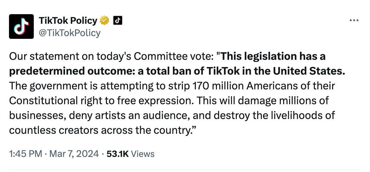 In early March of 2024, the U.S. House Energy and Commerce Committee voted 50-0 to advance a bill that would force ByteDance to divest from TikTok US, or face a nationwide ban.